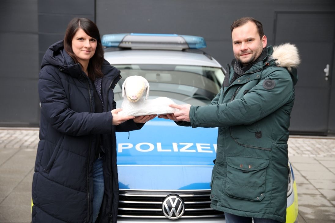 - Polizeiobermeisterin Elsner übergibt Diakonie-Vorstand Seidel das verschollene Lamm.