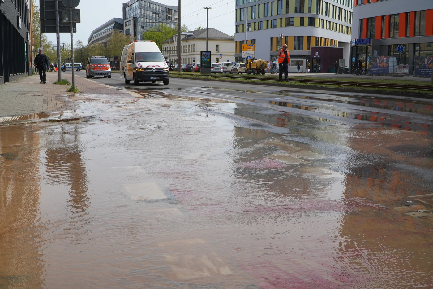 Wasserrohrbruch auf der Prager Straße neben dem früheren Technischen Rathaus - stadteinwärts in Höhe der Kreuzung Gerichtsweg: Am Montagnachmittag (kurz nach 14 Uhr) liefen dort plötzlich Unmengen von Wasser auf die Straße. Die Wasserwerke sind seit kurz nach 15 Uhr mit Mitarbeitern zur Untersuchung vor Ort, sagte uns Sprecherin Katja Gläß auf Anfrage. Was für ein Rohr dort geborsten ist, konnte sie uns deshalb noch nicht sagen.