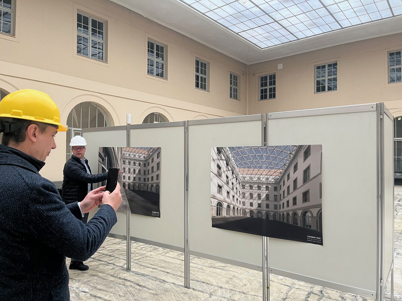 - Baubürgermeister Kühn (li.) vor den Plänen für den Rathaus-Lichthof