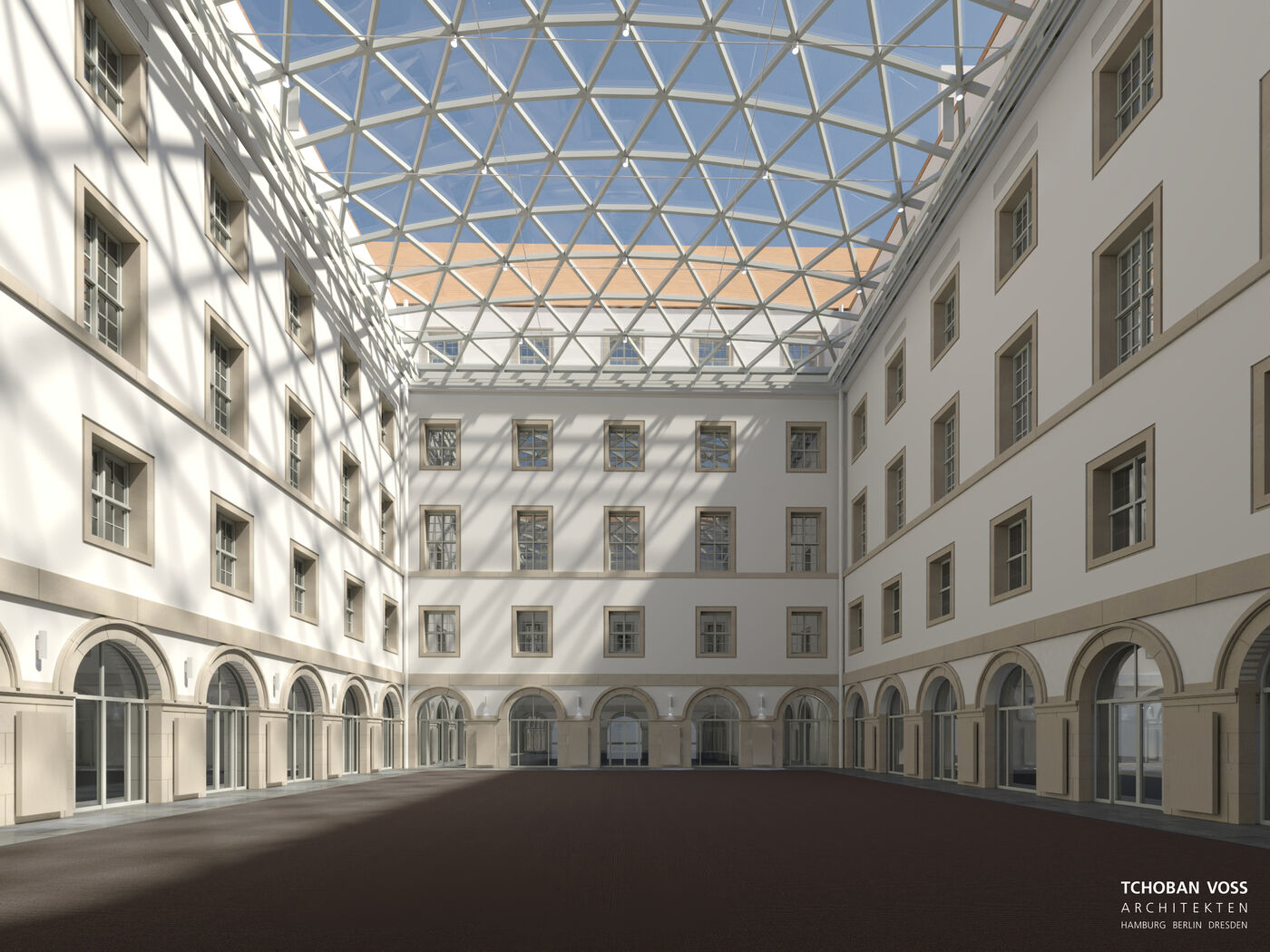 Für den 22 x 32 Meter großen Lichthof im Rathaus zeichnet das Büro Tchoban Voss und Partner verantwortlich. Die bestehende, niedrige Überdachung wird zurückgebaut und an historischer Stelle über dem 3. Obergeschoss durch ein Stahl-Glas-Dach ersetzt. Auch der Fußboden wird angehoben, so dass der Lichthof zukünftig nicht mehr über Treppen, sondern barrierefrei zugänglich ist. Dazu kommen neue Sanitärräume und moderne Veranstalungstechnik.