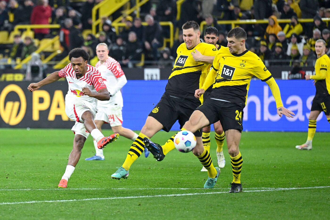 Dieser Platzverweis hinterließ sichtbare Wirkung. Leipzig erhöhte umgehend das Tempo und kam durch Simakan (19.) und Haidara (21.) zu ersten Chancen. Das schnelle Kombinationsspiel brachte die Dortmunder Abwehr auch in den folgenden Minuten gehörig ins Wanken. Weil es dem BVB in Unterzahl zunächst nicht gelang, mit Offensivaktionen für Entlastung zu sorgen, nahm der Druck stetig zu. Der Rückstand schien nur eine Frage der Zeit. Es passte ins Bild der kriselnden Borussia, dass er durch ein Eigentor zustande kam. Nach Ecke des Leipzigers David Raum köpfte Bensebaini den Ball ins eigene Tor.