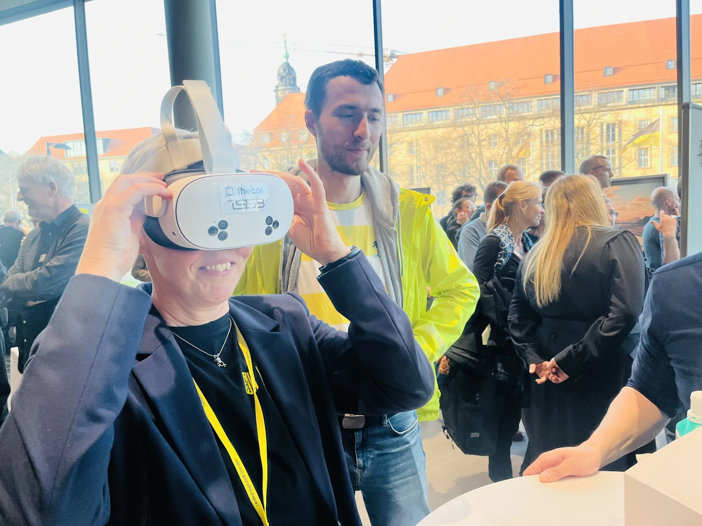 - Grit Ernst, die Projektleiterin der neuen Carolabrücke, blickt durch die VR-Brille schon mal auf das neue Bauwerk