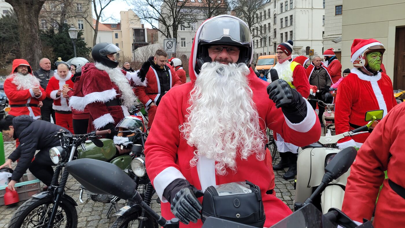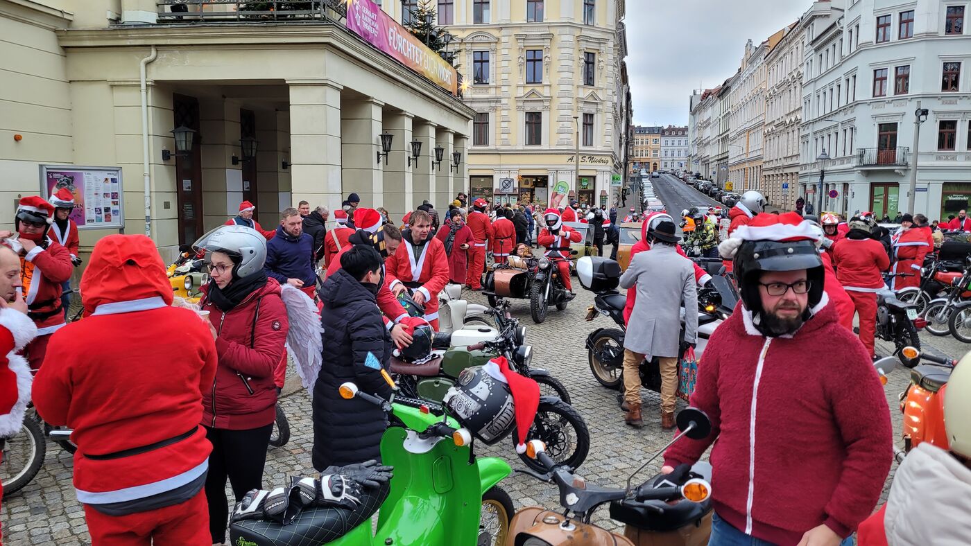 Kutsche und Rentierschlitten hatten sie daheim gelassen. Mehr als 60 Weihnachtsmänner und -frauen auf Mopeds, Motorrädern und Quads haben den Görlitzerin ein frohes Fest gewünscht. Sie knatterten am Vormittag durch die Stadt – u.a. vorbei am Kinderheim. Zum ersten Mal mit dabei war  Eric aus Weißenberg. „Aus Spaß an der Freude,um auch den Kindern was  zu zeigen“, wie er uns sagte. Zum rollenden Tross gehörten vor allem Simson-Mopeds, die Kultmarke des Ostens.