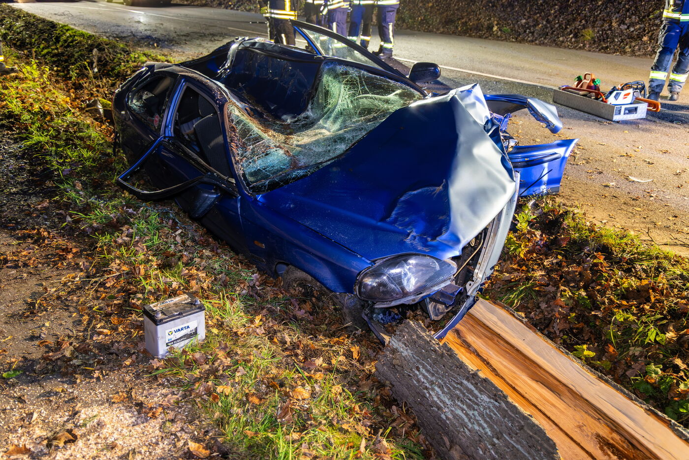 Die Kollision war so heftig, dass der Baumstamm umknickte und direkt auf das Auto stürzte, wobei das Autodach eingedrückt wurde. Der Fahrer wurde mit dem Rettungsdienst in ein Krankenhaus gebracht.