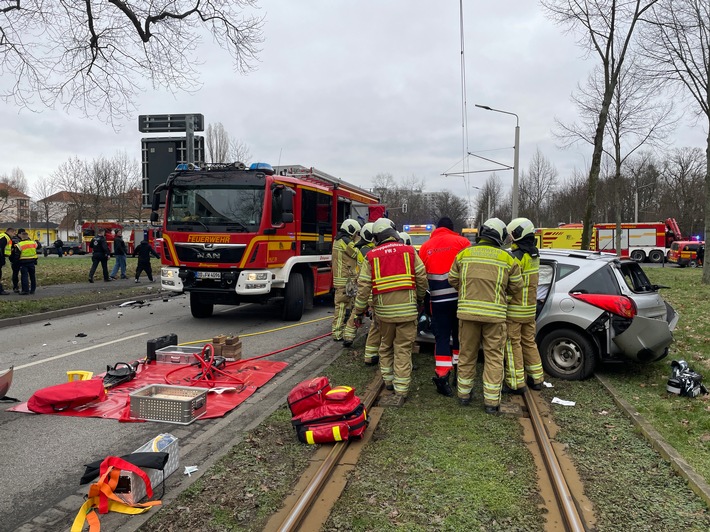Wie es vom Einsatzleiter der Feuerwehr hieß, war eines der Fahrzeuge auf die Straßenbahngleise geschleudert worden, das andere auf die Wiese neben dem Gehweg. Der Fahrer des Peugeot musste durch die Einsatzkräfte mit hydraulischem Rettungsgerät aus seinem Fahrzeug gerettet werden.