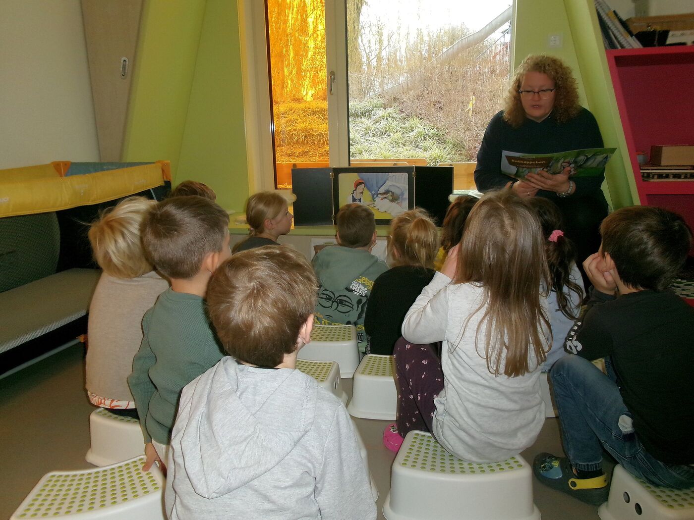 - Aufmerksam hören die Kinder Vorlesepatin Manuela Hache zu.