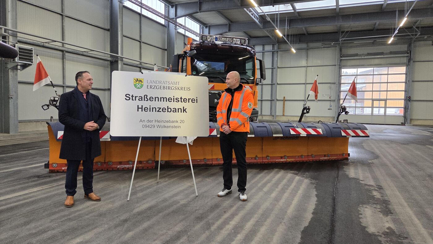 An der Heinzebank ist am Freitagvormittag die neue Straßenmeisterei symbolisch eingeweiht worden. Für neun Millionen Euro ist die erste Kompaktmeisterei des Erzgebirgskreises entstanden. Sie vereint Sozialgebäude, Fahrzeughalle und Werkstatt unter einem Dach. Außerdem gibt es eine große Salzhalle für 3.000 Tonnen Salz.