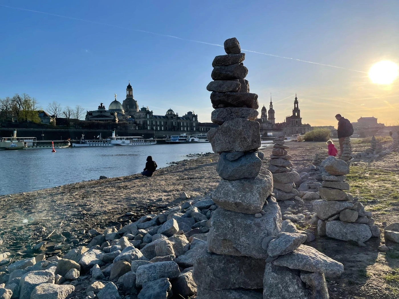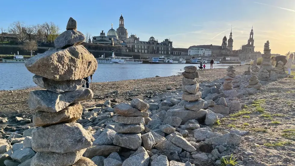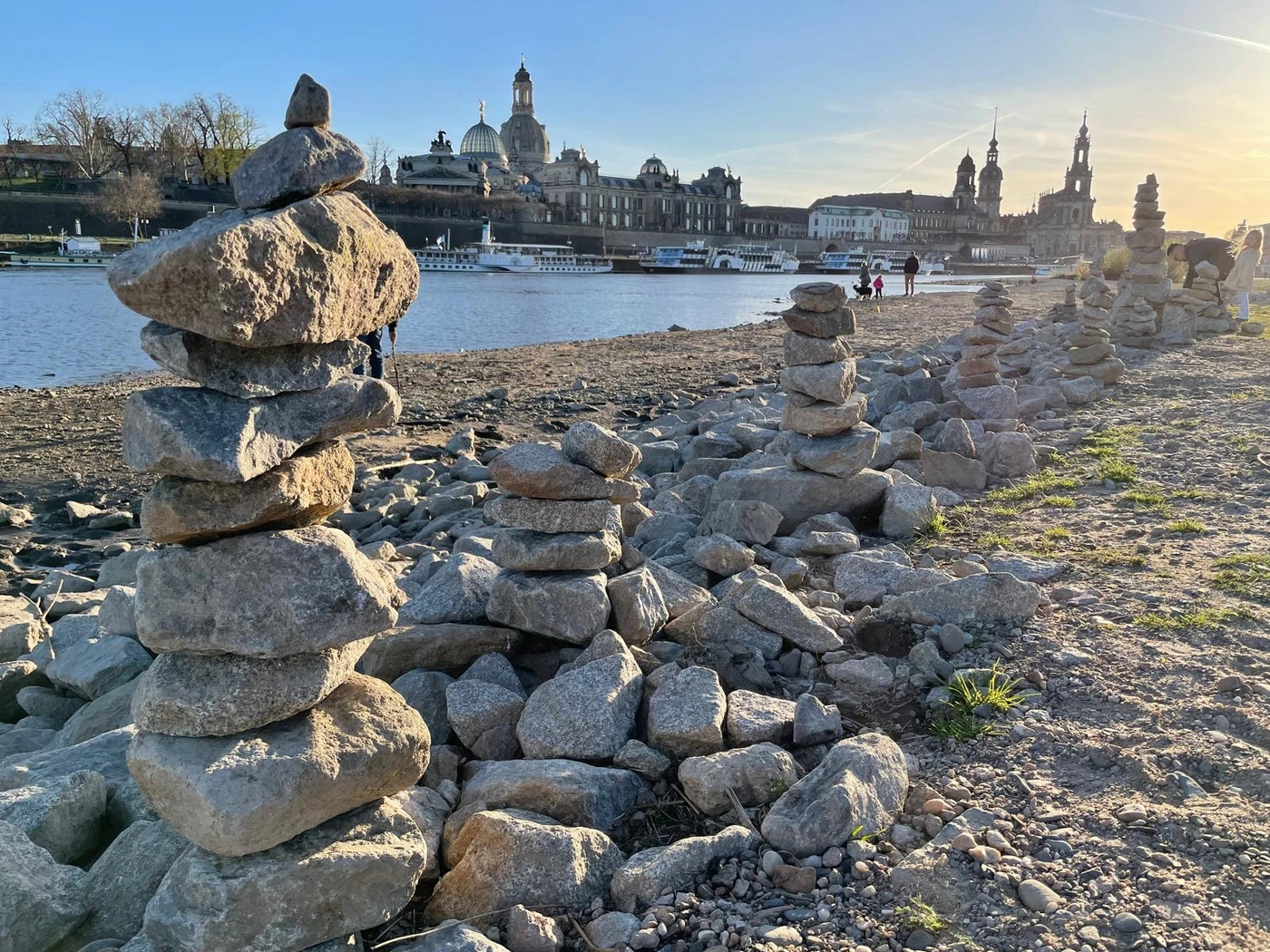 Derzeit bauen dort immer mehr Unbekannte aus Elbkieseln und herumliegendem Bauschutt kleine Steintürmchen. Ähnlich wie am Ostseestrand: Unten die großen, dicken, oben die kleineren Steinchen. Das Fotomotiv taucht immer öfter mit der legendären Altstadtkulisse im Hintergrund im Netz auf.