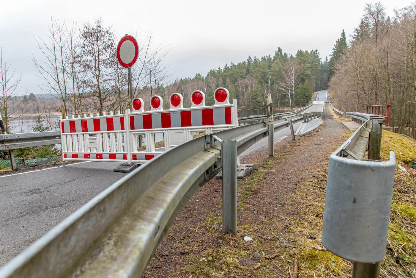 Am Staudamm des Teiches, über den die Straße verläuft, gibt es schon seit 2020 Probleme mit der Standsicherheit. Seitdem ist der Bereich nur noch wechselseitig und mit Tempo 30 befahrbar. Außerdem wird das Bauwerk kontinuierlich überwacht.