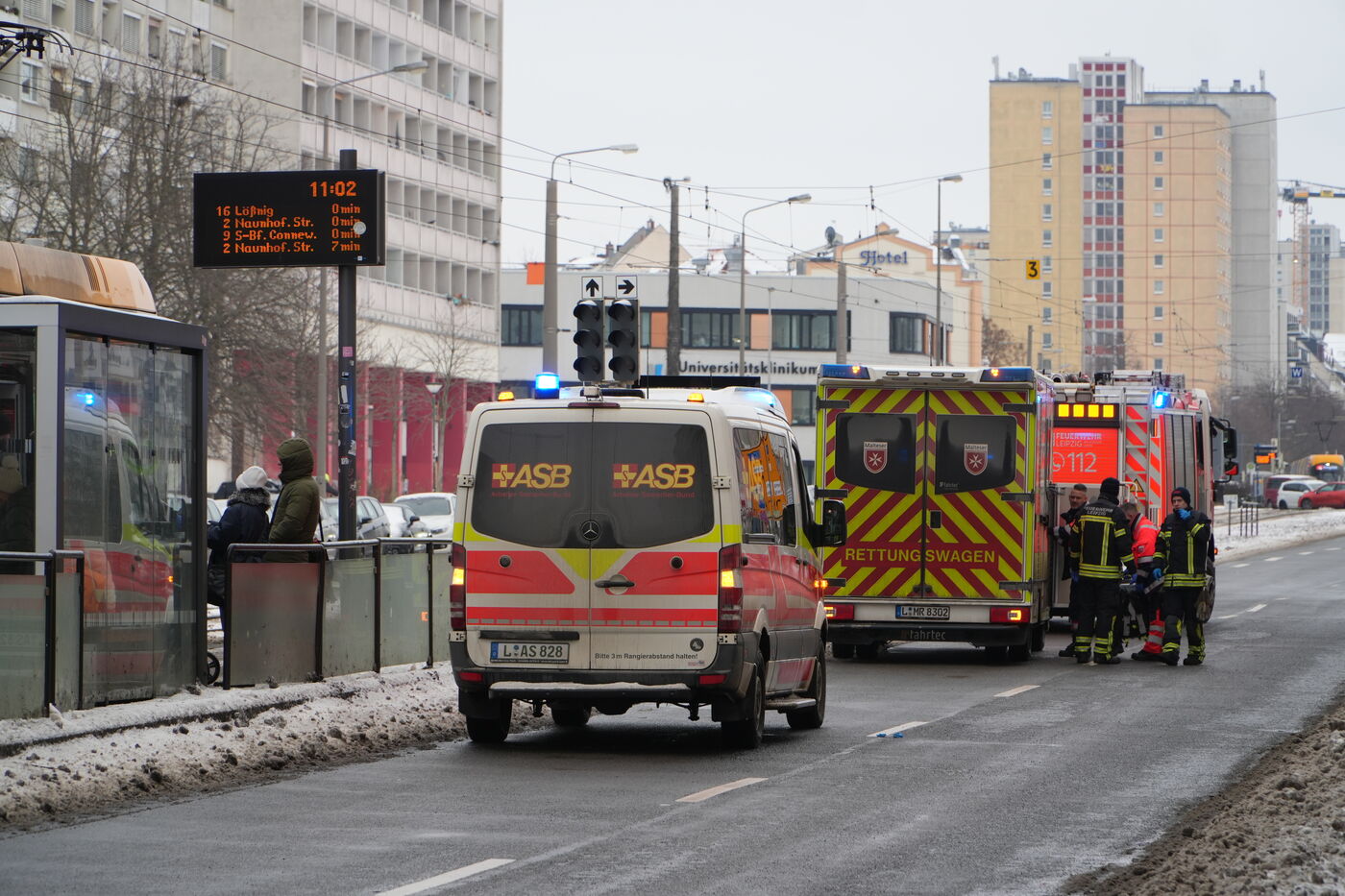 - Straßenbahn-Stau gegenüber der Leipziger Uni-Klinik am Bayrischen Platz in Leipzig.