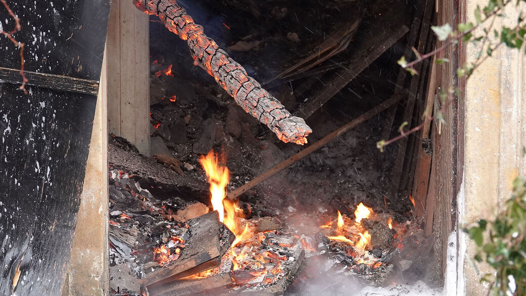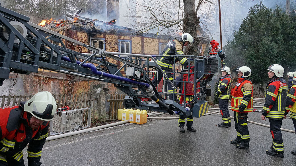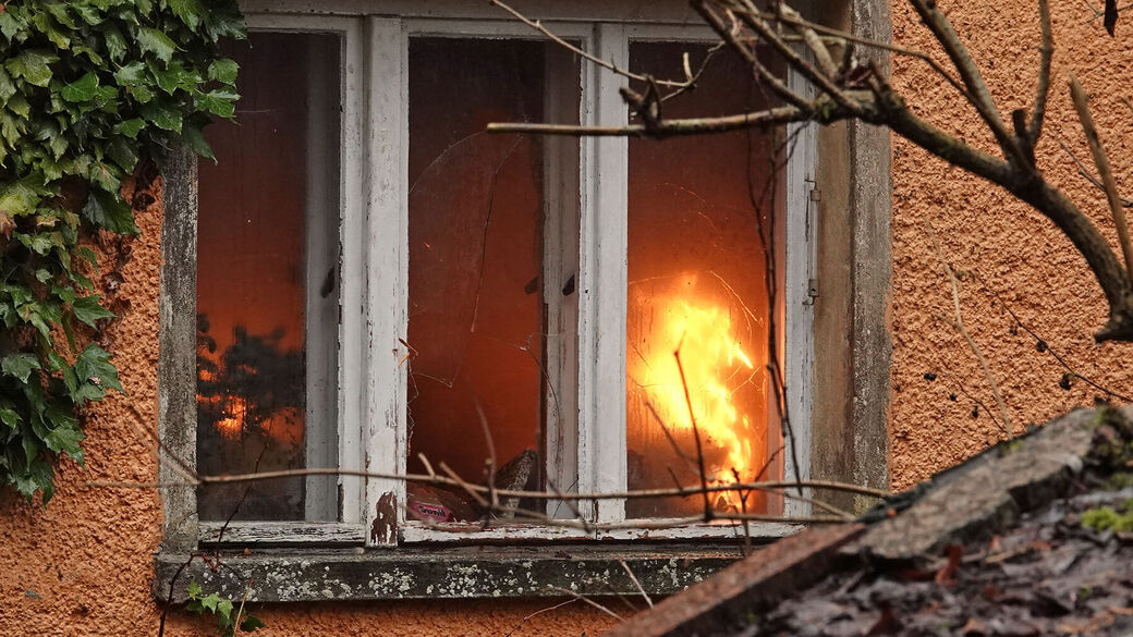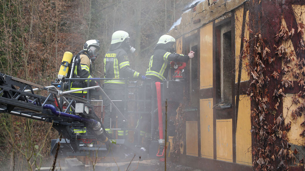Laut Polizei wurde das Feuer am Montagvormittag gegen 8 Uhr gemeldet. Die Feuerwehr kämpfte stundenlang gegen die Flammen, doch das Gebäude an der Talmühlenstraße war nicht mehr zu retten.