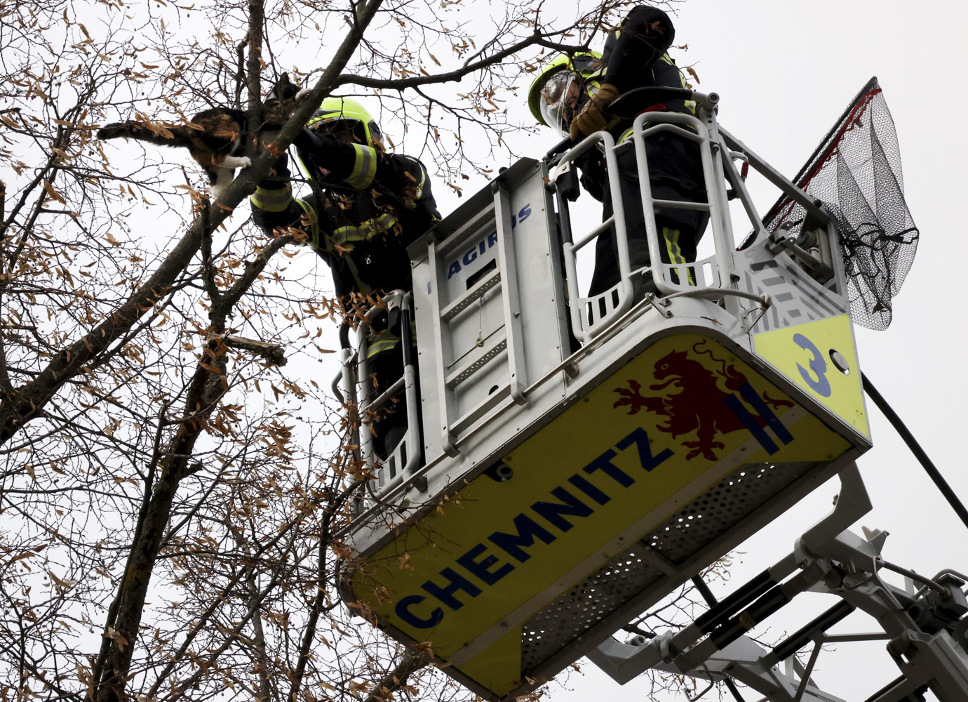 Ganz sicher gint es der Mietze hundeelend. Die Szene beginnt hoch oben in der Krone eines kahlen Baums. Zwei Feuerwehrleute stehen in einer Drehleiter, die über die Dresdner Straße ragt. Unter ihnen die graue Novemberluft, vor ihnen ein verängstigtes Tier. Die Katze klammert sich an einen dünnen Ast. Ein Feuerwehrmann streckt vorsichtig die Arme aus, sein Kollege sichert ihn. Die Leiter wippt leicht im Wind. Es sind Sekunden voller Konzentration.