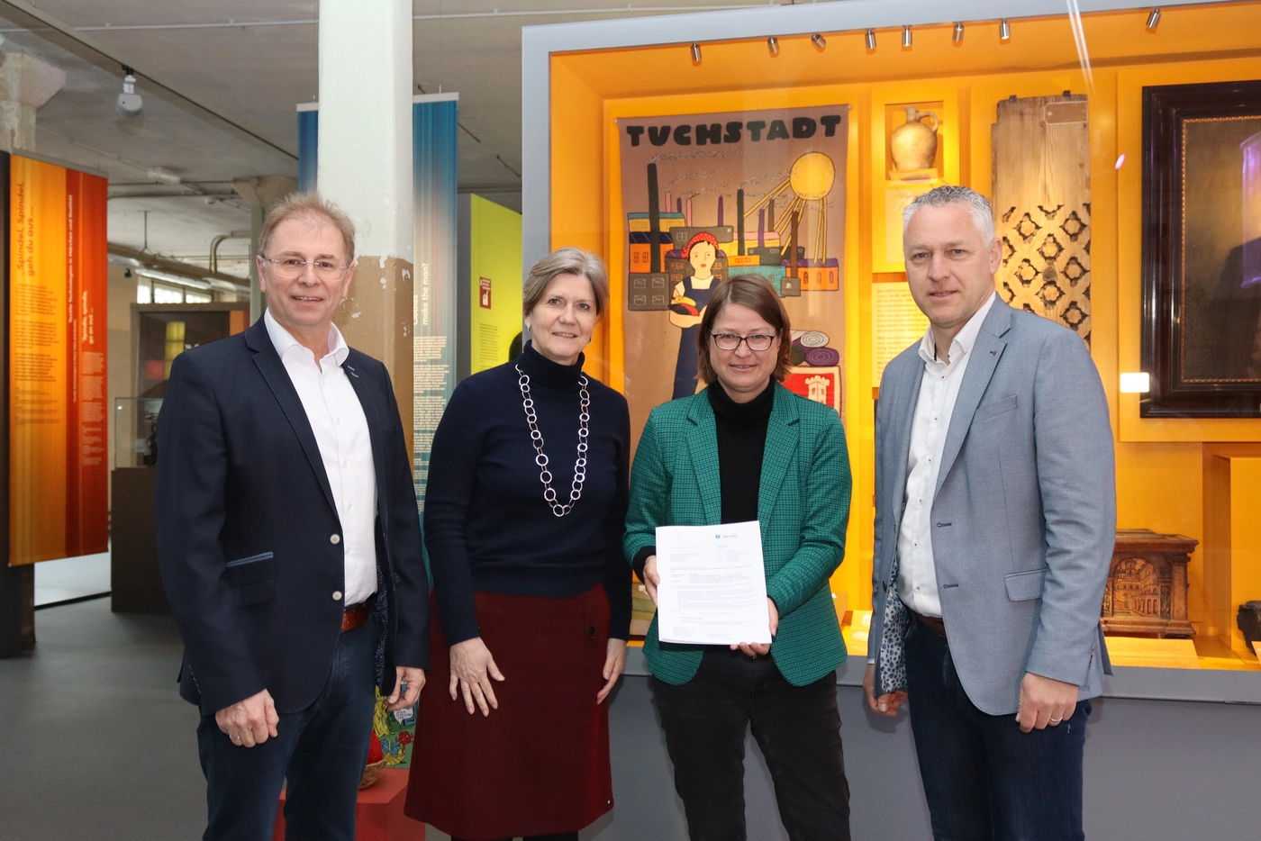 - Oberbürgermeister André Raphael, Geschäftsführerin des Zweckverbandes Sächsisches Industriemuseum Dr. Susanne Richter, Museumsleiterin Dr. Birthe Hemeier und Landrat Carsten Michaelis (v.l.n.r.)