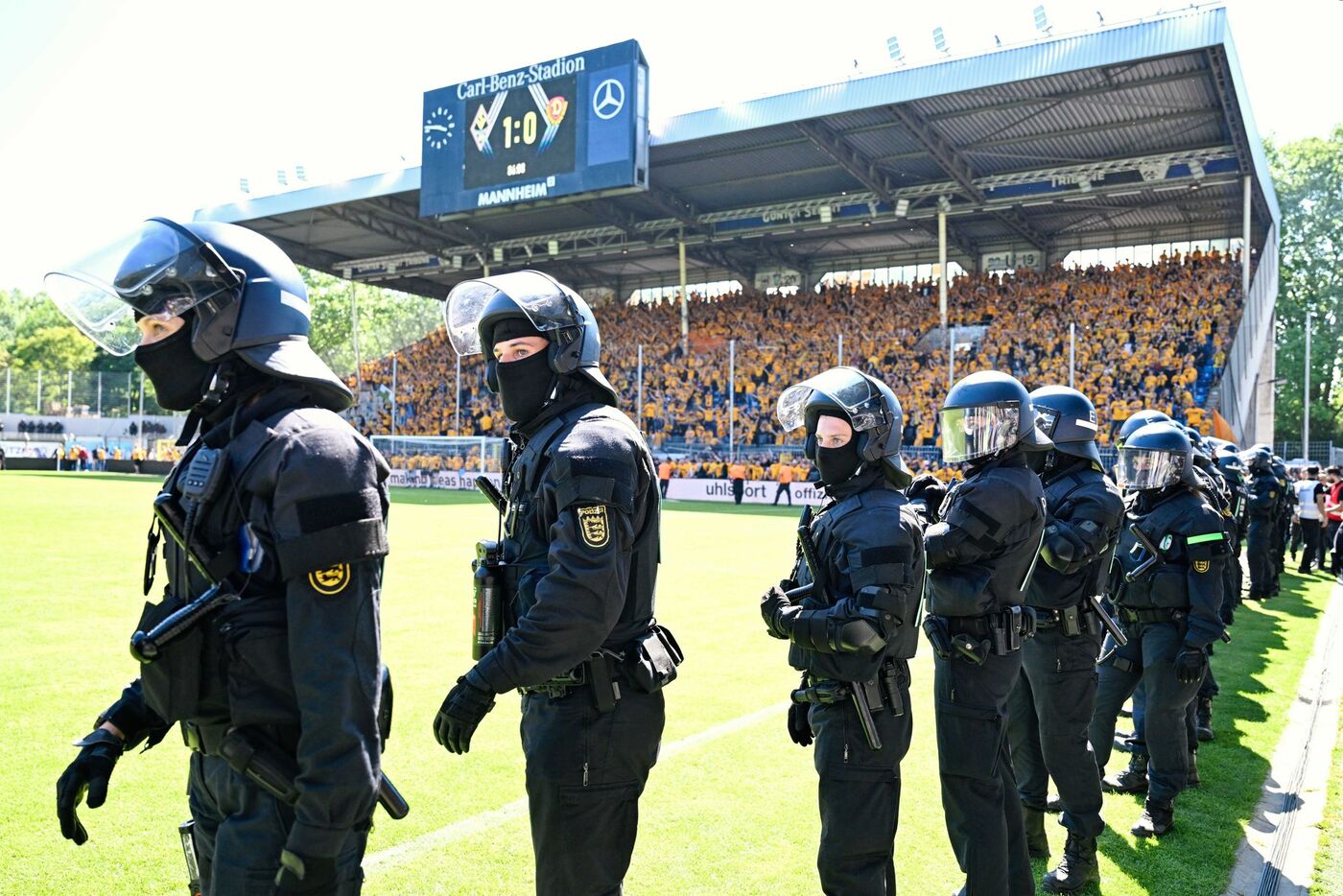 Außerdem stürmten nach Abpfiff Hunderte Dresdener Fans das Feld. „Ein Rauchkörper wurde in Richtung eines Polizisten geworfen, zudem schossen Dresdener Anhänger mindestens zehn Raketen in Richtung von Mannheimer Anhängern und Einsatzkräften der Polizei sowie des Ordnungsdienstes“, teilte der DFB mit. (dpa)