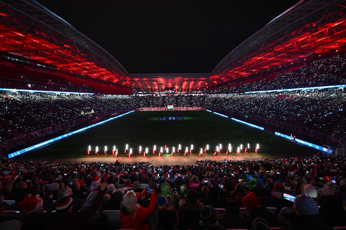 Rund 31.000 Menschen haben am Sonntagabend im RB-Stadion gemeinsam Weihnachtslieder gesungen. Nach der noch etwas holprigen Premiere letztes Jahr habe die Veranstaltung dieses Jahr für Gänsehaut-Momente gesorgt, twitterte der Bundesligist am Abend bei „X“. Unterstützt von den Gewandhaus-Chören wurden Klassiker wie „Leise rieselt der Schnee, “Schneeflöckchen„ oder “Alle Jahre wieder„ geträllert. Den Abschluss bildete eine spektakuläre Laser-Show über dem Stadion.
