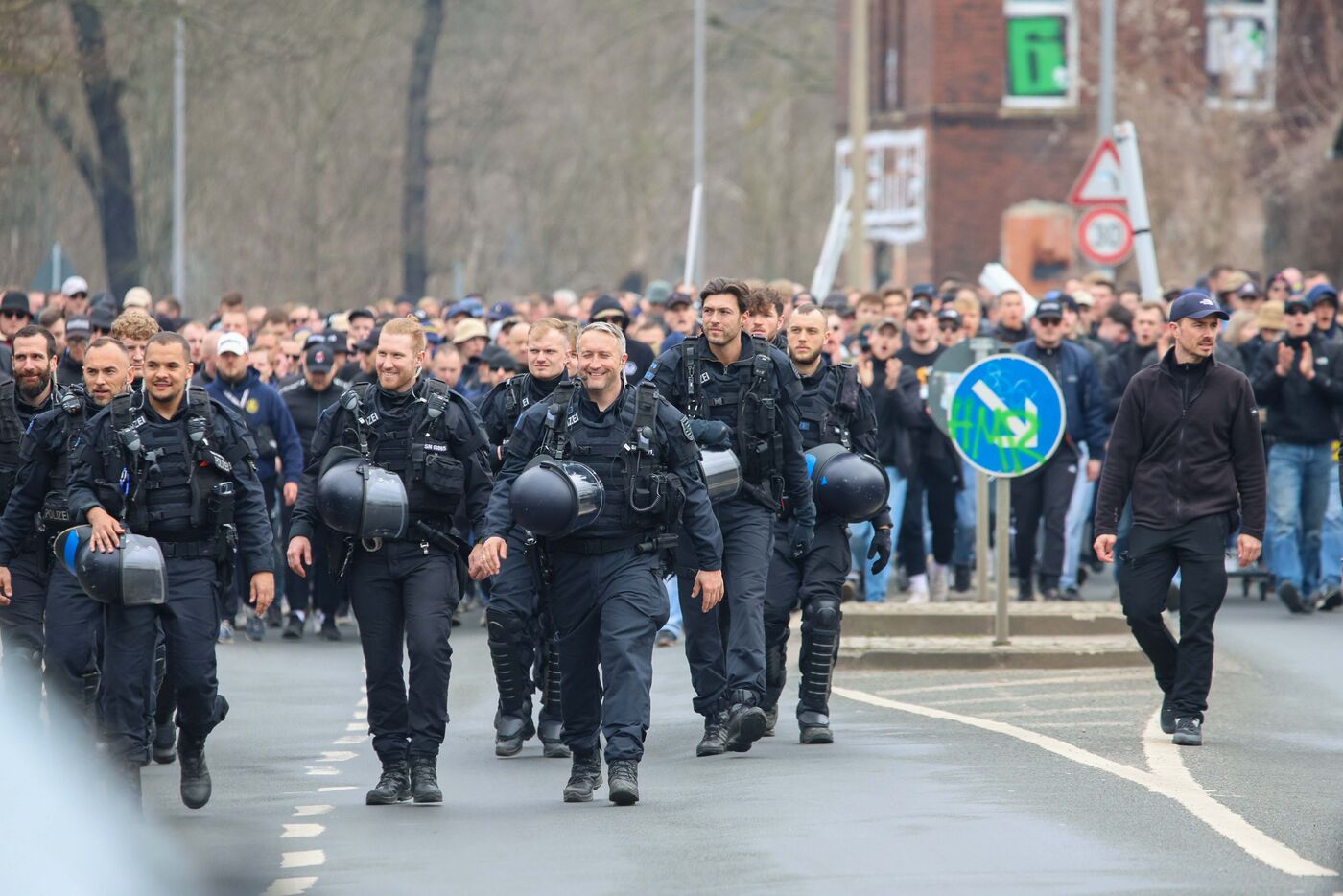 Und hier kommen die Lok-Fans - natürlich auch mit (gut gelaunter) Polizei-Eskorte