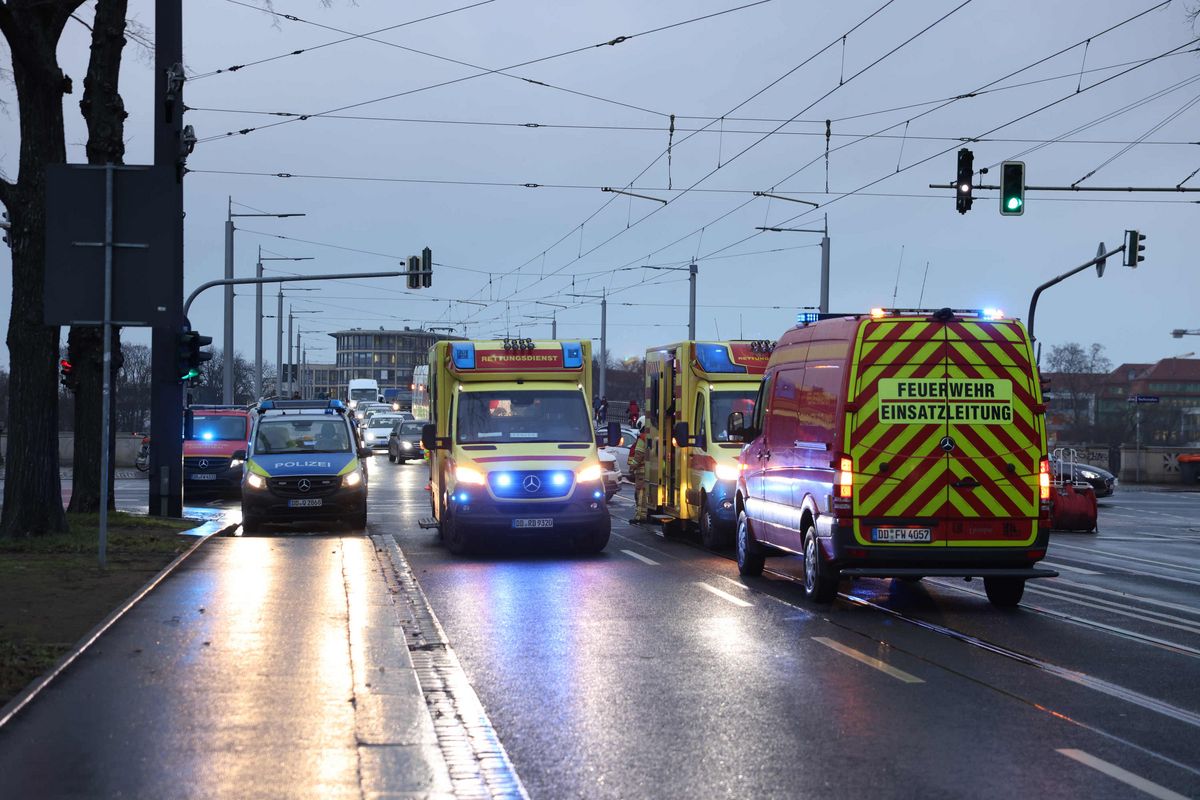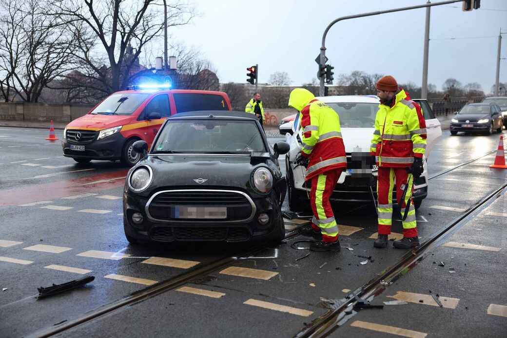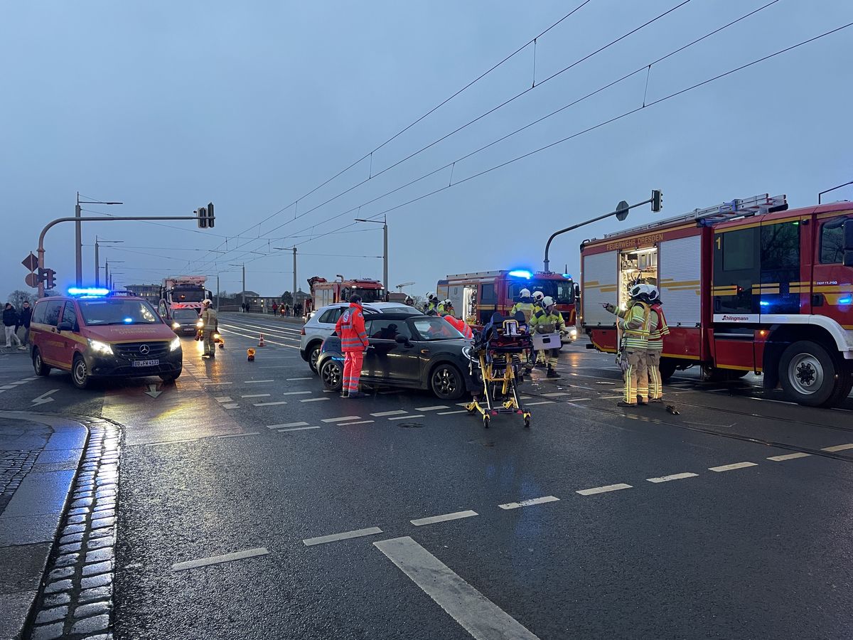 Nach ersten Informationen der Feuerwehr wurden dabei zwei Menschen verletzt. Der Fahrer eines VW und die Fahrerin des beteiligten Mini wurden vom Rettungsdienst versorgt und in ein Krankenhaus gebracht. Rund um den Sachsenplatz staute sich der Verkehr. Die DVB mussten Umleitung fahren.