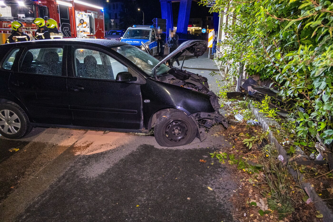 Im Kreisverkehr an der Hauptwache hatte der Fahrer eines VW Polo beim Ausfahren die Kontrolle verloren. Er prallte gegen einen Bordstein, fuhr durch einen Gartenzaun und kam schließlich an einer Hauswand zum Stehen. Nach dem Unfall verließen mehrere Personen das Fahrzeug und verschwanden.