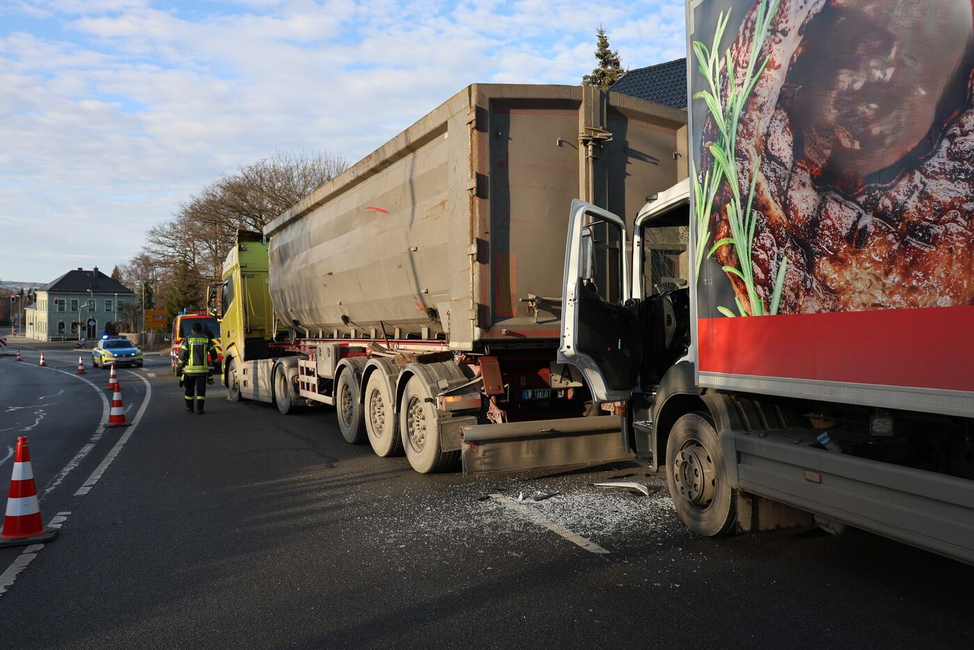 In Annaberg sind am Freitagmittag auf der B95 zwei Autos und zwei Lkw zusammengestoßen. Zwischen der Geyersdorfer Straße und der Feldschlösschenkreuzung waren zwei VW und zwei nachfolgende Laster Richtung Schönfeld unterwegs. Aus noch ungeklärter Ursache kam es zur Kollision. Ein Marcedes-Lkw fuhr dann auf den vor ihm fahrenden Muldenkipper auf. Der Mercedes-Fahrer und zwei Insassen der Pkw wurden nach Informationen unseres Reporters vor Ort verletzt ins Krankenhaus gebracht.