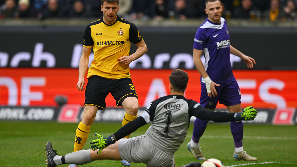Erzgebirge Aue hat das Sachsenderby in Dresden verloren. Das Spiel vor über 33 000 Zuschauern endete 1:2. Christoph Daferner (2.) brachte die Gastgeber schnell in Führung, Aues Antwort kam jedoch durch Omar Sijaric schon nach 13 Minuten. Bis in die zweite Hälfte hielt Aues Martin Männel die Veilchen im Spiel. In der 32. Minute parierte der Torwart zunächst den Elfmeter von Daferner, anschließend blieb er auch im Nachschuss gegen Tony Menzel Sieger. In der 64. Minute gelang Dominik Kother nach Vorarbeit von Jakob Lemmer der 2:1-Siegtreffer - sein erstes Tor im Dresdner Trikot.