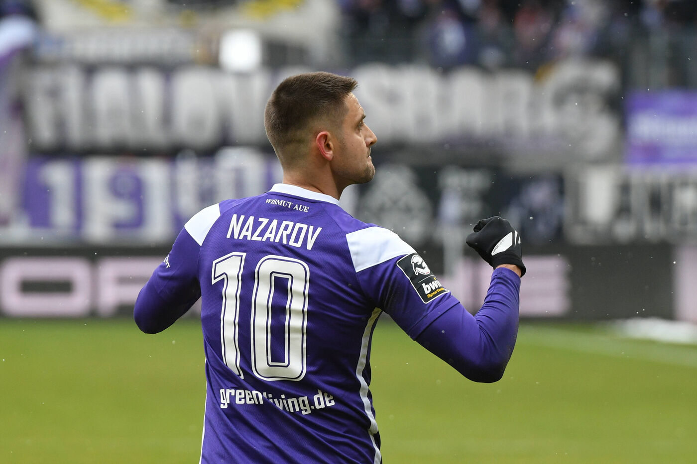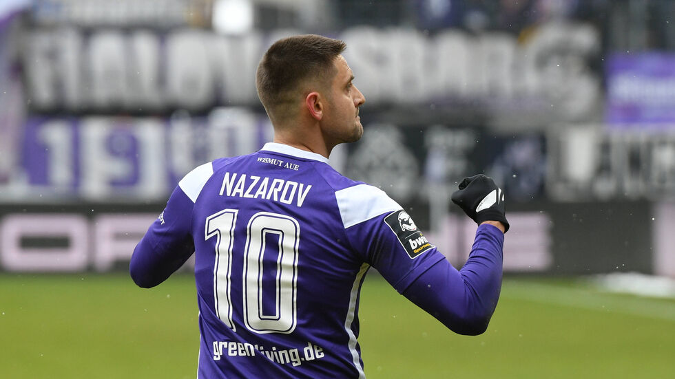 Dank Doppelpacker Dimitrij Nazarov ist Erzgebirge Aue wieder in der Erfolgsspur. Das Team von Trainer Pavel Dotchev gewann am Samstag das Drittliga-Duell gegen den Tabellen-Nachbarn Rot-Weiss Essen mit 2:1 (2:0). Vor 7076 Zuschauern, darunter 819 aus Essen, schoss Nazarov (22. Minute) Aue per Elfmeter in Führung, nachdem er selbst gefoult worden war. Danach erhöhte er acht Minuten später erneut vom Punkt. Der eingewechselte Thomas Eisfeld (66.) erzielte den Anschlusstreffer für die Gäste.