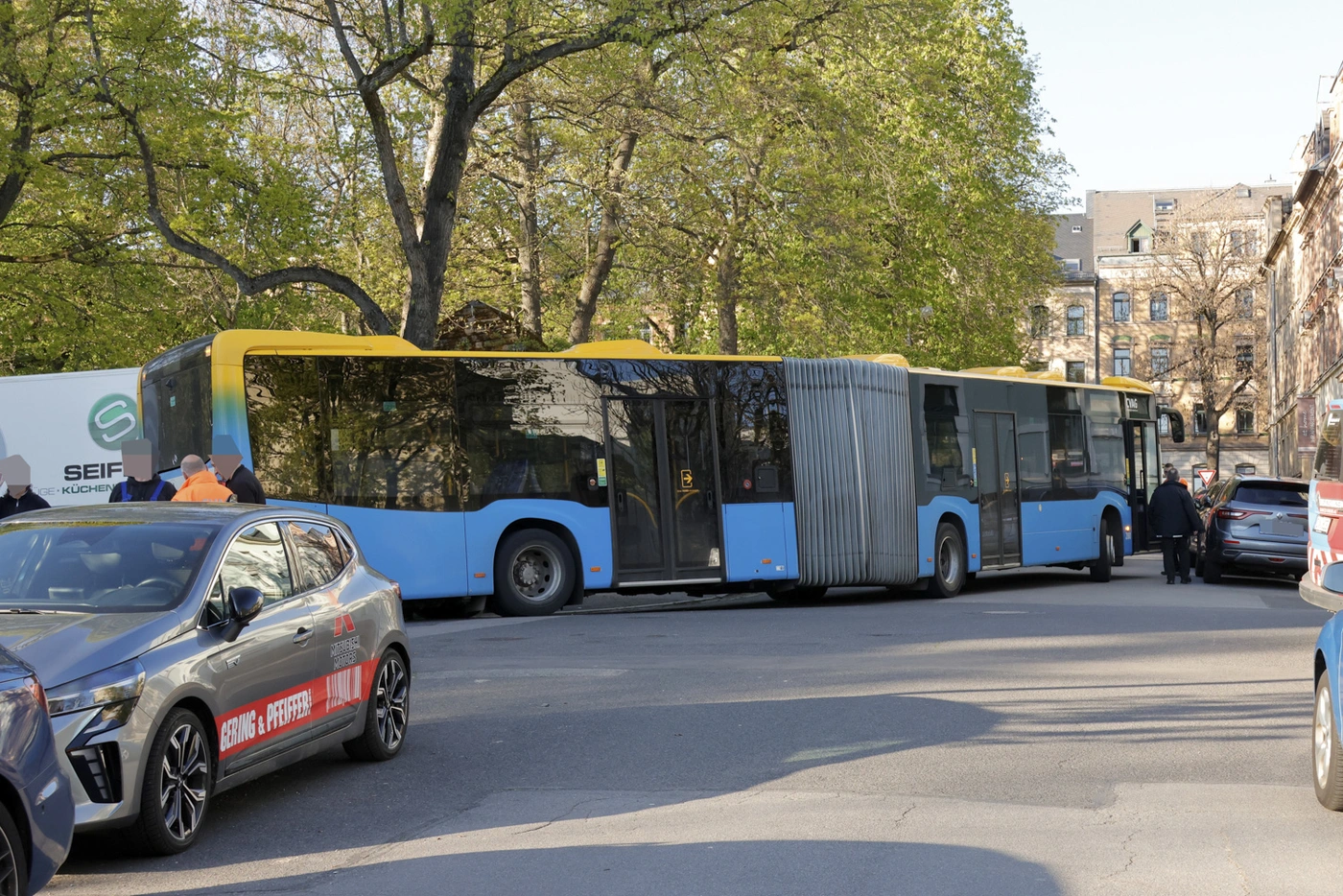 Ein ungewöhnlicher Busunfall hat sich am Mittwochnachmittag gegen 17 Uhr an der Kreuzung Klarastraße und Friedrich-Naumann-Straße in Chemnitz-Hilbersdorf ereignet. Wie ein Reporter berichtet, hatte der Fahrer eines Linienbusses sich offenbar „verfahren“. Er versuchte, von der Klarastraße in die Friedrich-Naumann-Straße abzubiegen. Die Straße war für den Bus aber zu schmal, sodass er gegen ein geparktes Auto stieß. Der Unfall blockierte zeitweise die gesamte Kreuzung.