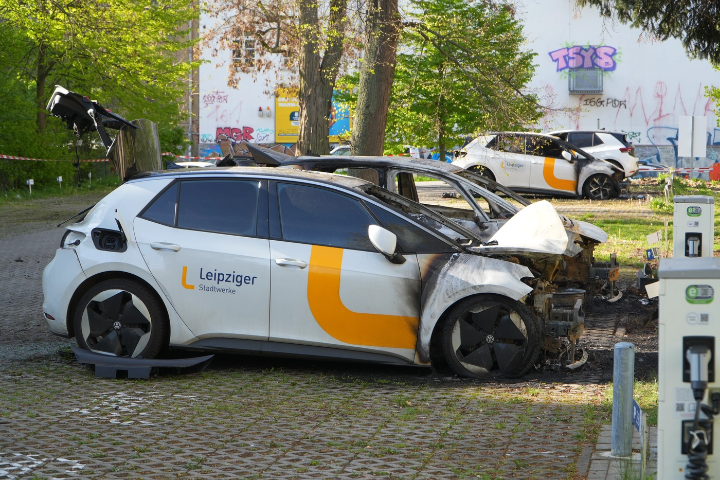 Auf einem Parkplatz an der Eichendorffstraße in Leipzig-Connewitz haben heute früh vier Elektro-Autos der Stadtwerke gebrannt. Gegen 4 Uhr hatte es einen lauten Knall gegeben, Anwohner alarmierten Feuerwehr und Polizei. Die Autos, vier ID.3, wurden allesamt im vorderen Bereich schwer beschädigt, es entstanden vermutlich über 100.000 Euro Schaden.