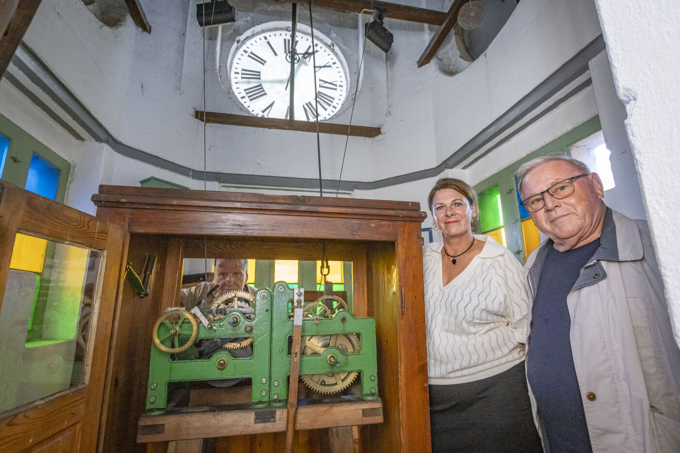 - Frieder Hering (li. hinten), Apothekerin Claudia Meerz und Wolfgang Queißer im alten Uhrenturm. Queißer zieht einmal wöchentlich das Uhrwerk per Hand auf