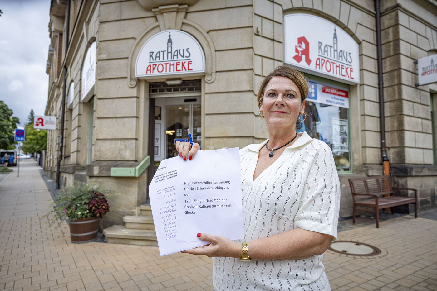 - Apothekerin Claudia Meerz sammelt Unterschriften gegen das Abschalten der Glocke in ihrem Gebäude