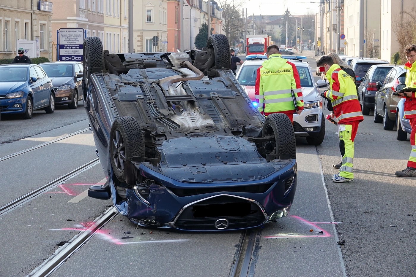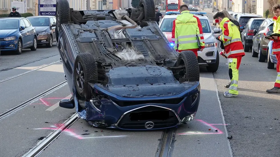 Vollsperrung: Auto überschlägt sich auf Leipziger Straße