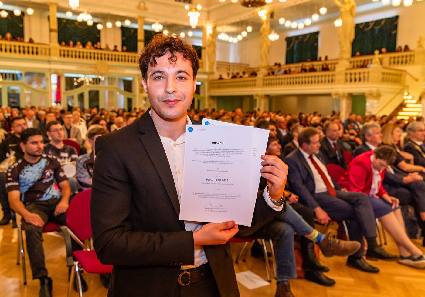 Im Rahmen der Immatrikulationsfeier wurde der DAAD-Preis für herausragende Leistungen ausländischer Studierender an Firas Jerbi aus Tunesien verliehen. Er studiert im fünften Semester des Masterstudiengangs „Management and Information Technology“ an der WHZ mit Bestnoten. Jerbi unterstützt Kommilitonen als Mentor, bietet kostenlose Programmierkurse auf seinem YouTube-Kanal an und engagiert sich ehrenamtlich beim Deutsch-Tunesischen Freundschaftsverein sowie als DAAD-Alumnus.