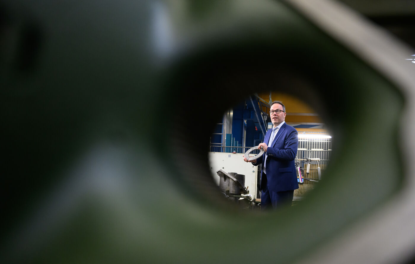 - Wirtschaftsminister Dirk Panter besucht die MWK Defence GmbH in Königswartha, steht hinter einem Schwingarm für den Panzer Leopard 2