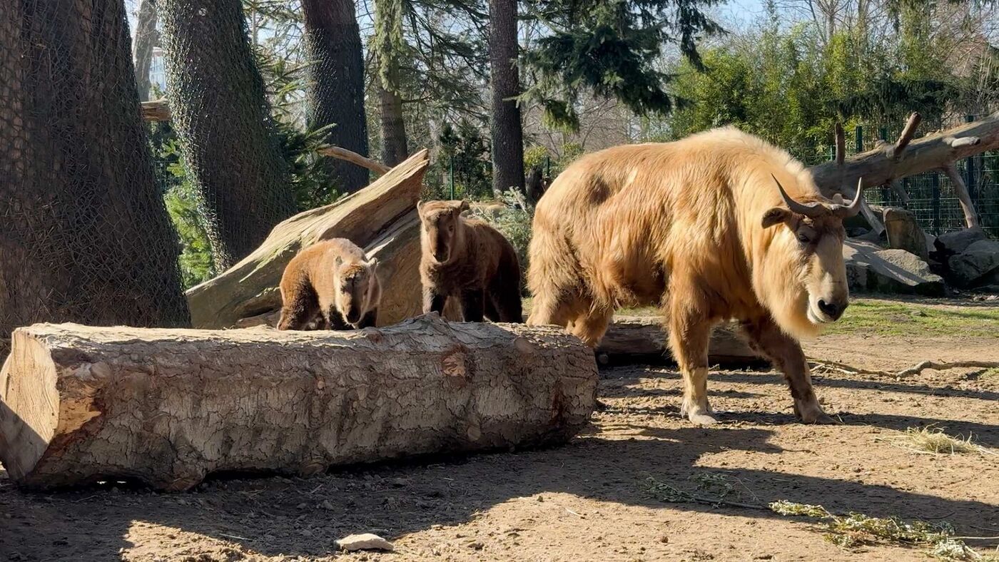 Es ist wie im Kindergarten jetzt„, meint ein Tierpfleger. Außerdem auf der Anlage zu sehen, sind Vater Bian Fu und der große Bruder Hiro, der vor einem Jahr auf die Welt kam. Obwohl der Goldtakin wie eine Mischung aus Ziege und Rind aussieht, ist er näher mit Ziegen und Schafen verwandt als mit Rindern. Er gehört zu den Ziegenartigen. Dies ist eine Tiergruppe der Hornträger. Sie sind Pflanzenfresser und sind perfekt an felsige und bergige Lebensräume angepasst.