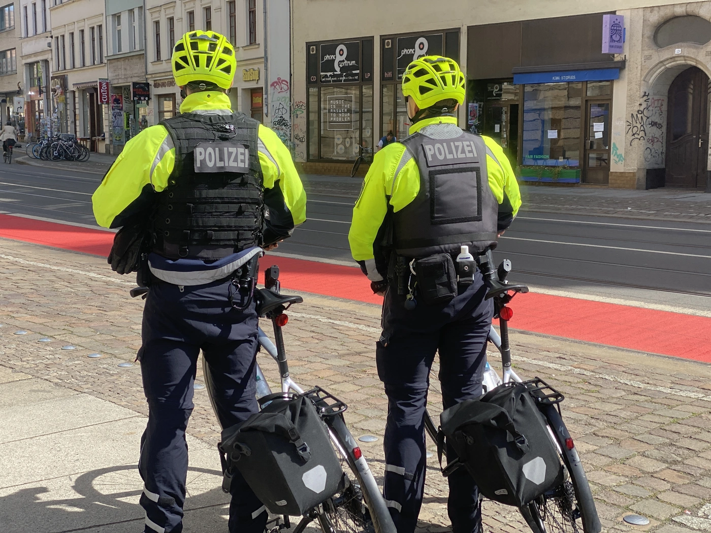 - Die behelmten Beamten waren selbst auch stets bereit, eventuell fliehende Täter mit dem Fahrrad zu verfolgen.